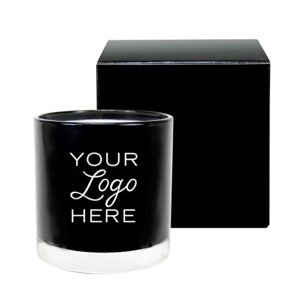 11 oz promotional candle in attractive black glass, featuring soy wax, matching black gift box, and optional white or black wax. By default, wax color is white. To upgrade to black wax, add $1. Optional bow tied ribbon upon request, add $1.25 per box.