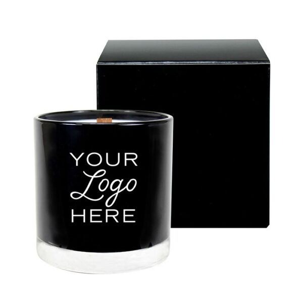 Premium weight 11 oz promotional candle, featuring wooden wick, black glass and matching black gift box. Optional bow tied ribbon upon request, add $1.25