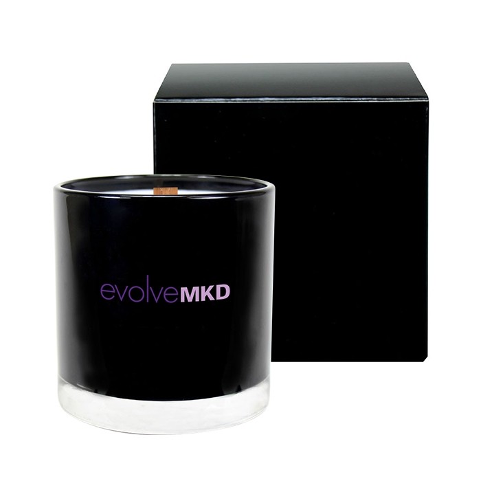 Premium weight 11 oz promotional candle, featuring wooden wick, black glass and matching black gift box. Optional bow tied ribbon upon request, add $1.25