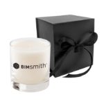 Premium weight 11 oz promotional candle in beautiful matte white or matte black giftbox, with black ribbon tied on front. Includes 1 color/location silkscreen imprint on clear glass.