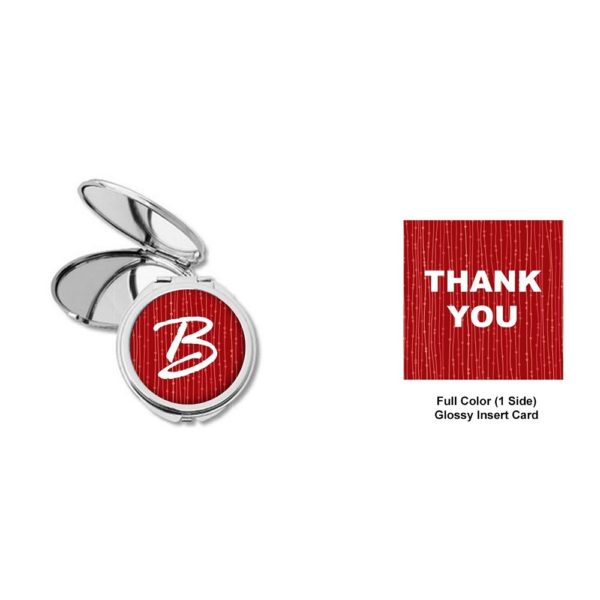 2.75 inch diameter round custom compact mirror. Includes laser engraved imprint. Individually polybagged.