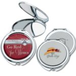 2.5 inch diameter round custom compact mirror with full color imprint and epoxy dome. Individually polybagged.