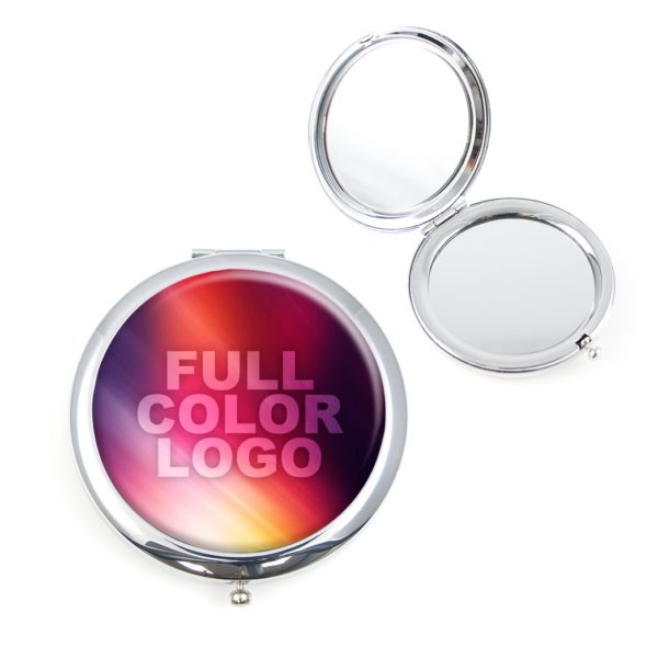 2.5 inch diameter round custom compact mirror with full color imprint and epoxy dome. Individually polybagged.