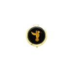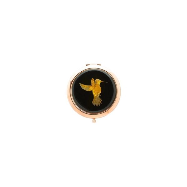 Quality gold compact mirror has push button feature, good weight, and makes a nice gift option. Includes full color imprint on center front. Individually boxed.
