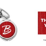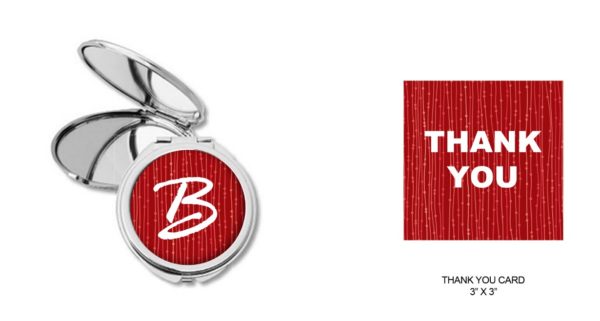 Round custom compact mirror with full color imprint and epoxy dome, paired elegantly with matching key tag. Two piece premium gift box included, with custom molded tray inside. Optional custom printed insert card 4cp.