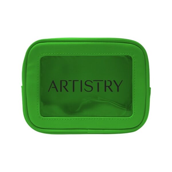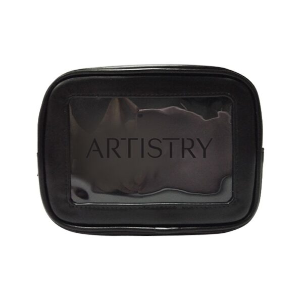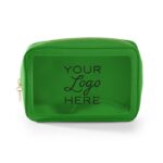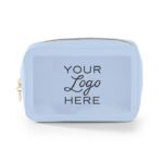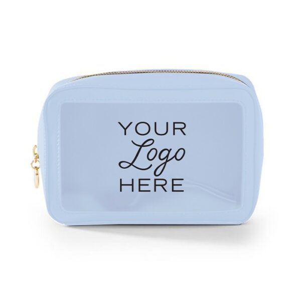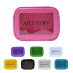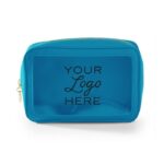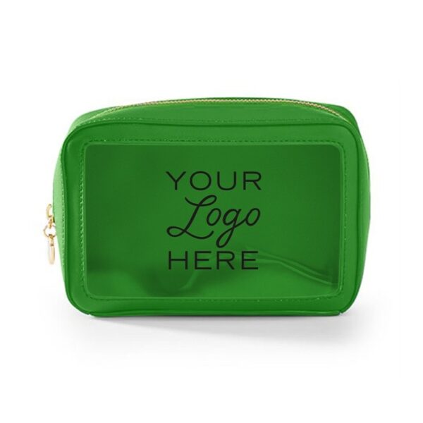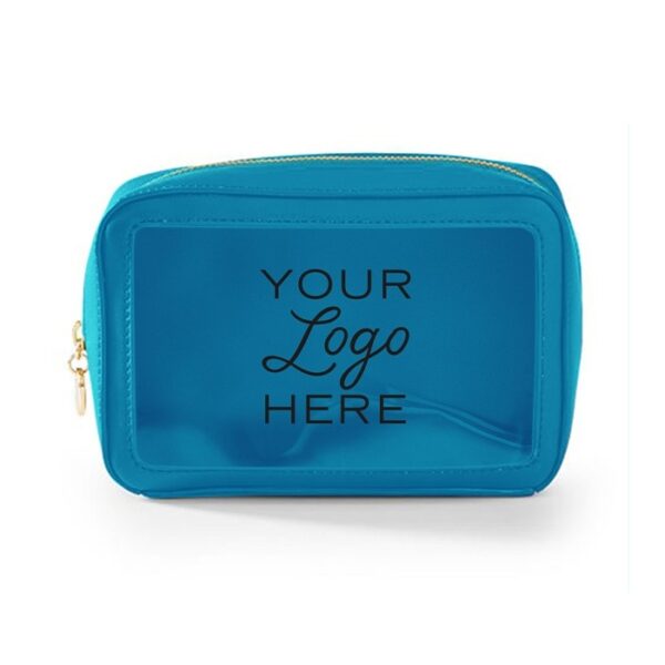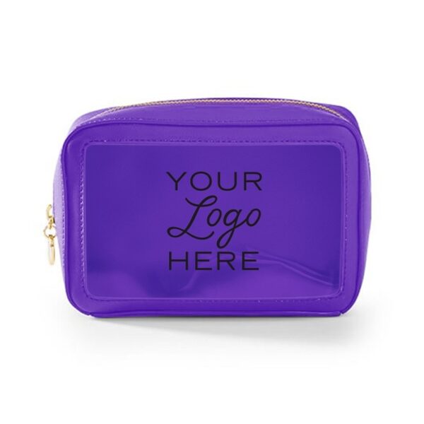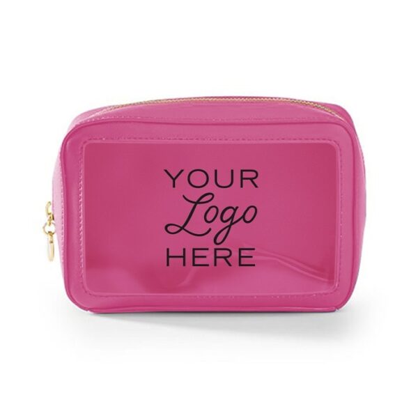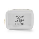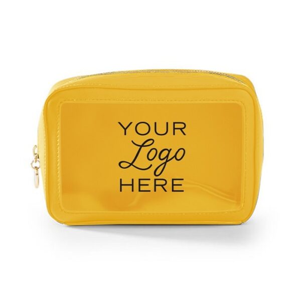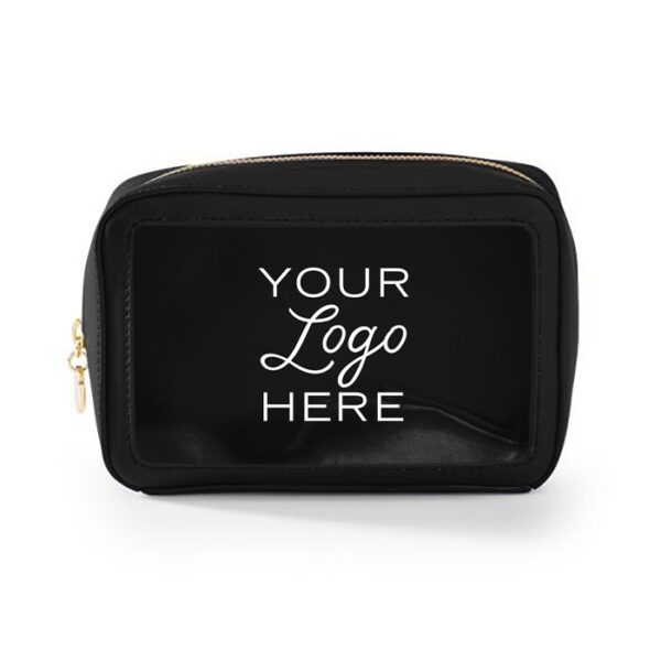 Travel amenities bag with gold or colored zipper (comes standard in matching colored zipper unless otherwise noted on PO). Features clear window for viewing and made of durable textured leatherette or smooth leatherette material. (Standard material is textured leatherette unless noted on PO). Silkscreen logo on front. Ask us about custom zipper pull options.