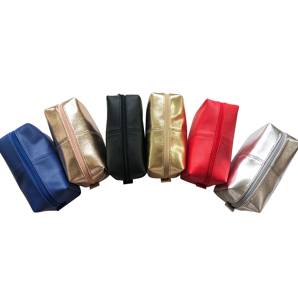 High quality leatherette material comes with large silver teeth zipper. Great travel bag, amenities bag, in a dopp kit style body shape. Can be in solid color or metallic color such as silver, gold or rose gold. Allover imprinting is also available. Debossed logo recommended.